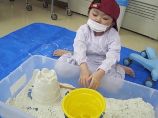千葉県こども病院では以前から、ボランティアや保育士、保護者が多数で見守れるときは幼児さんたちのお部屋で砂遊びをしています。